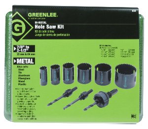 Several electrician’s kits available providing an assortment of the most commonly used Greenlee variable pitch hole saw sizes and arbors. High-impact, rugged plastic carrying case.