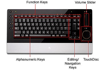 The keyboard includes the first-of-its-kind touch-sensitive TouchDisc, which enables people to scroll and navigate a graphical user interface without having to reach for a mouse — perfect for leaning back from the desk, for making a small adjustment when working at the desk, or for using a media PC in the living room. Moving a finger up and down or across the disc moves the cursor on the computer screen, and moving the finger in a circular motion around the perimeter of the TouchDisc enables people to scroll horizontally and vertically through documents.